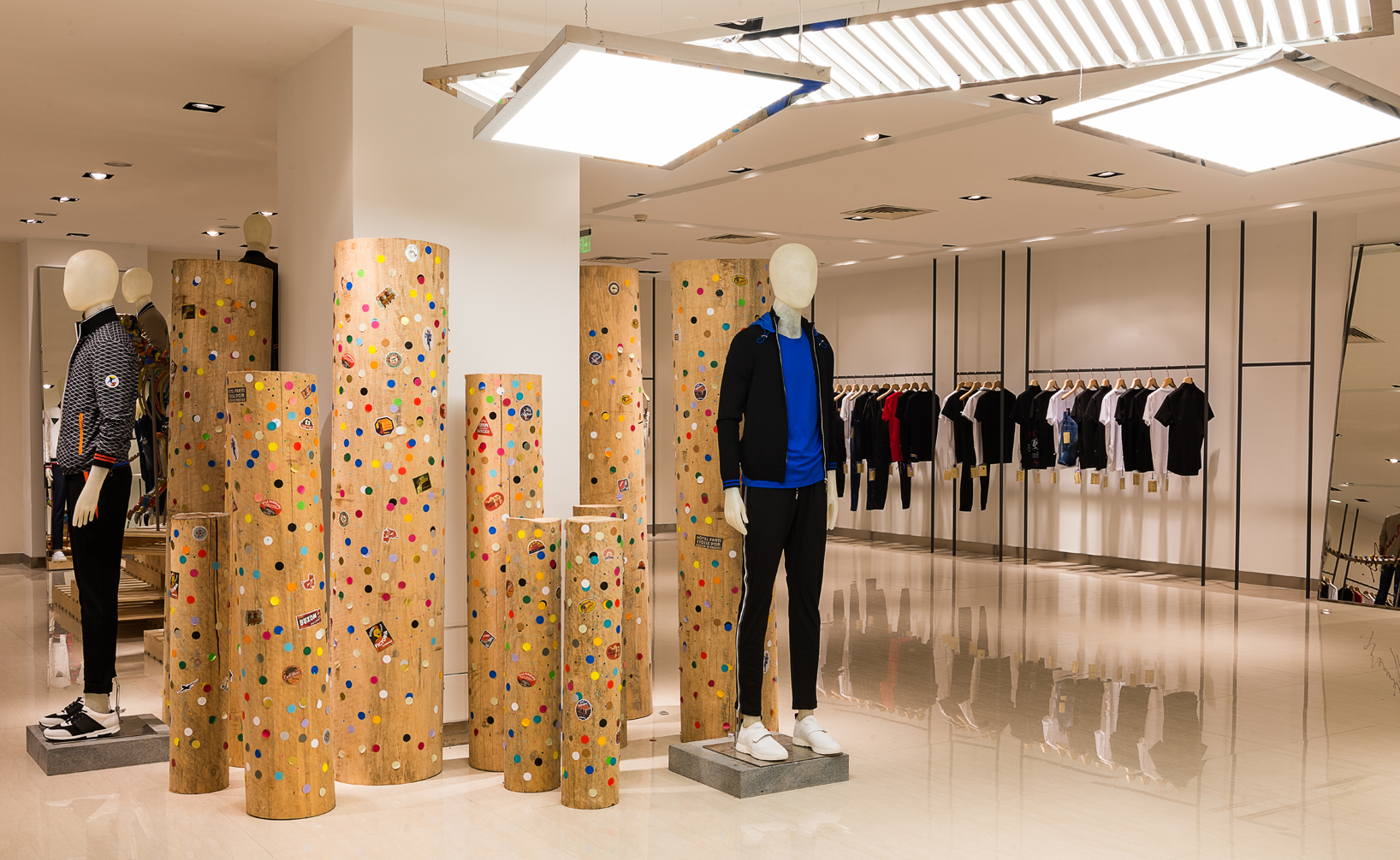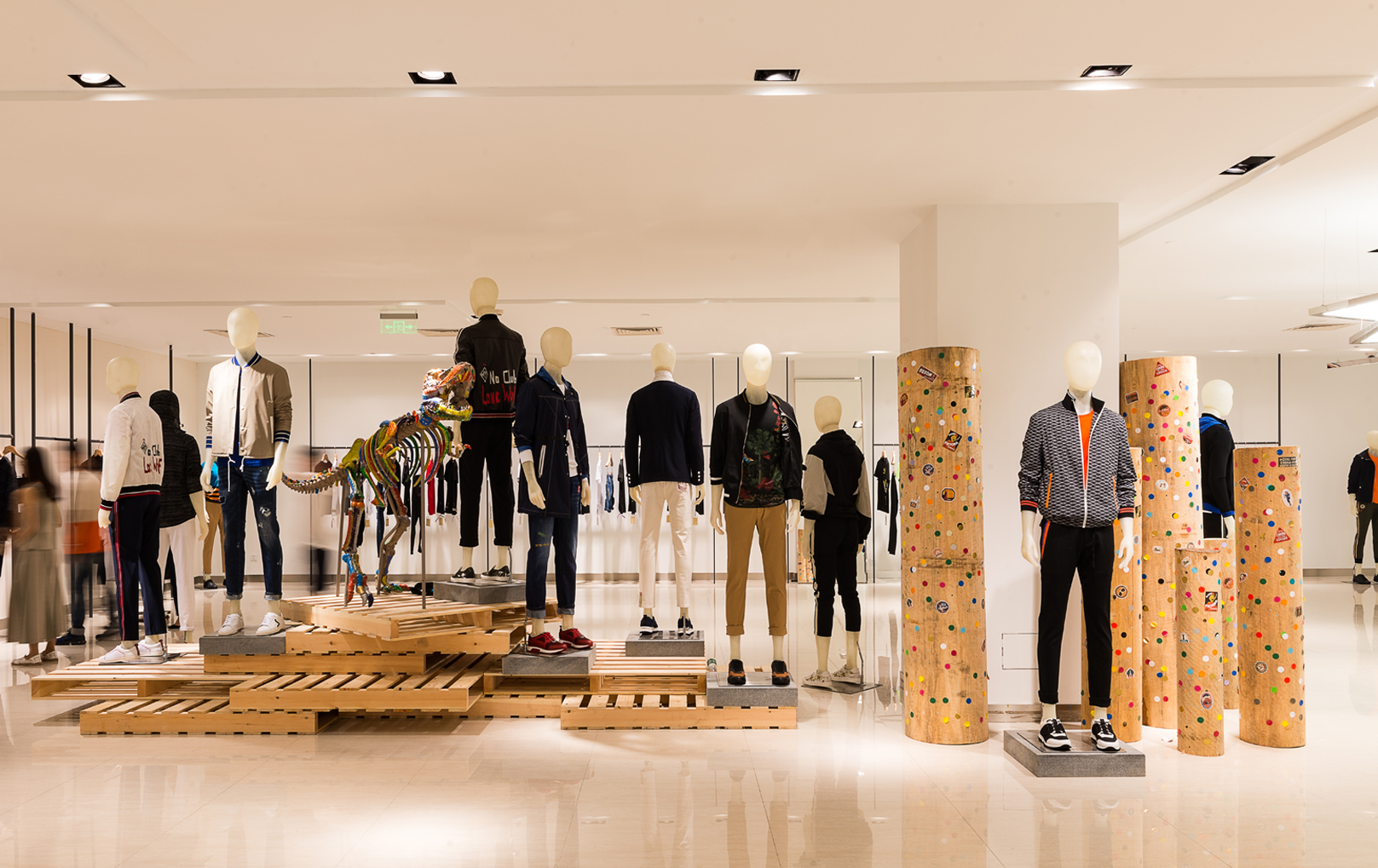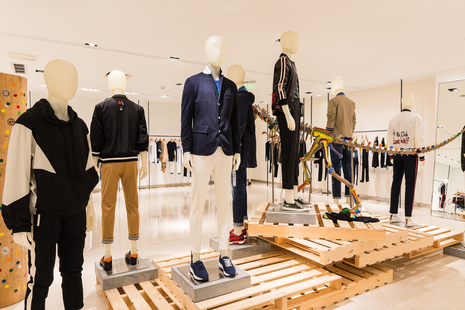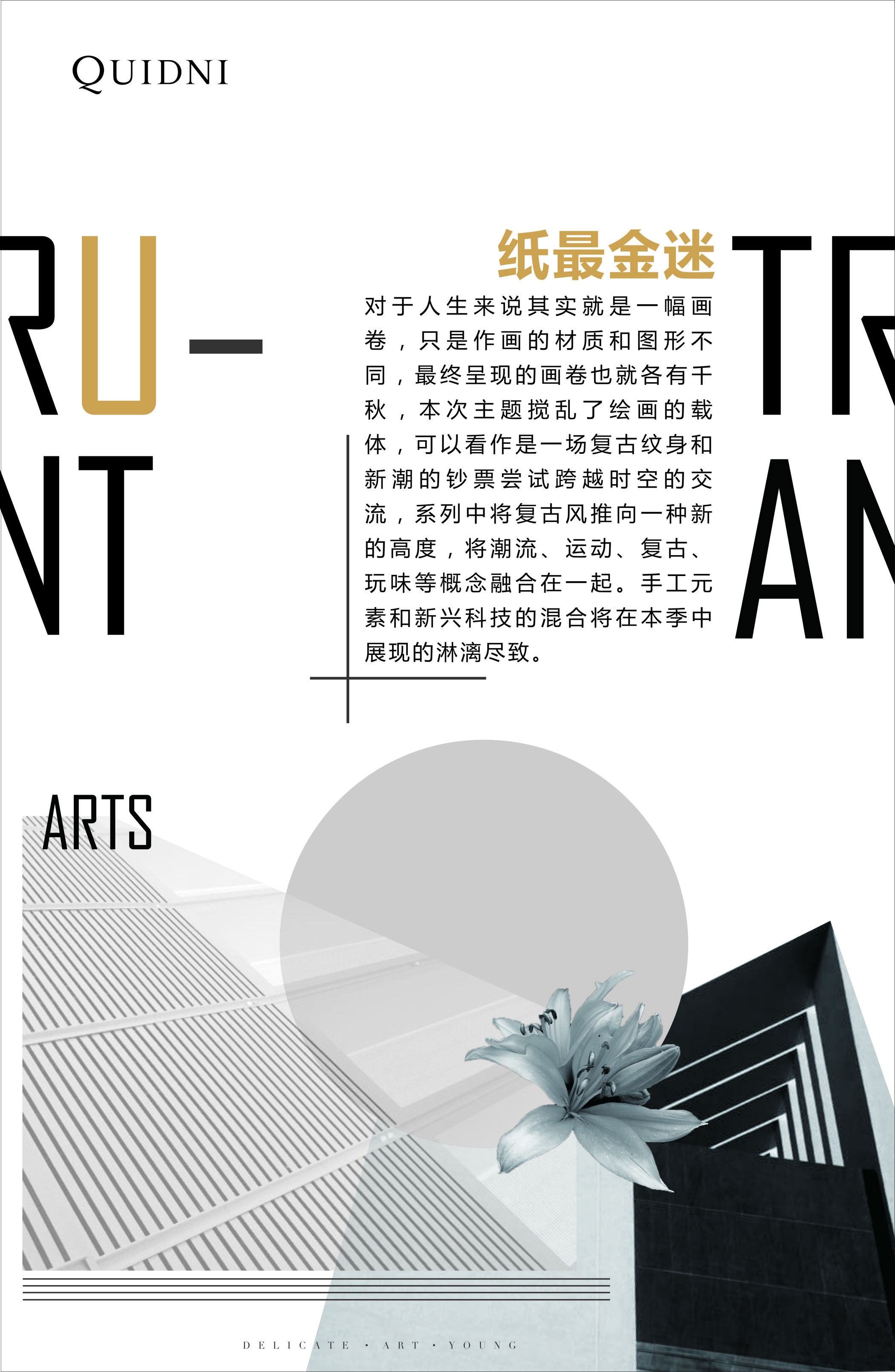 QUIDNI(昆狄) 2018春夏主题:纸最金迷对于人生来说其实就是一幅画卷,只是作画的材质和图形不同,最终呈现的画卷也就各有千秋,本次主题搅乱了绘画的载体,可以看作是一场复古纹身和新潮的钞票尝试跨越时空的交流,系列中将复古风推向一种新的高度,将潮流、运动、复古、玩味等概念融合在一起,将两个不同领域进行重组。手工元素和新兴科技的混合将在本季中展现的淋漓尽致。展厅展示2018春夏时尚发布会,为你开启全新时代